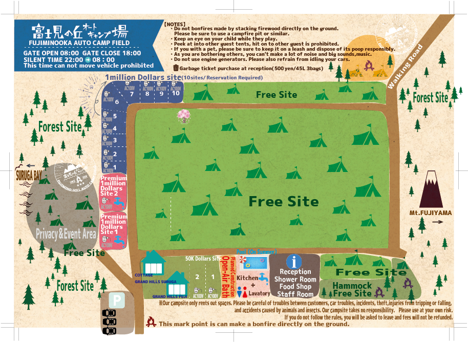 | 【구획 사이트】 ・프리미엄백만야경사이트 18,000엔/일박 ・백만야경사이트 8,800엔/일박(전원 사용 가능 2,000엔) ・50만야경사이트 10,000엔/일박(전원 사용 가능) |